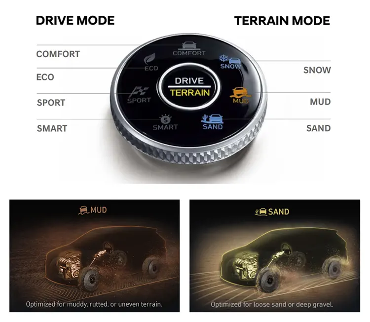 New PALISADE dilengkapi dengan empat mode penggerak (Comfort, Eco, Sport, Smart) dan tiga mode jenis medan sesuai dengan kondisi medan yang dapat dilalui. Pengemudi dapat memilih dari beragam mode berkendara berdasarkan preferensi pribadi maupun kondisi jalan.